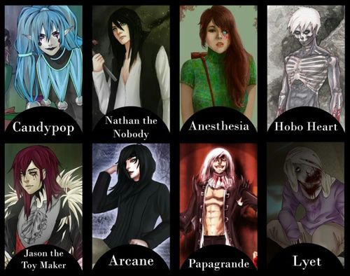 例如:Smile Dog(笑臉狗), Zalgo(史上無敵紅色大魔王), Nathan the Nobody(誰都不是的奈森), Rake(手像耙子的怪物), Bob(無手怪物), Black eyed children(黑眼小孩), Sally(可憐的死亡小女孩), Puppeteer(人偶師), Jason the Toy Maker(玩具師傑森), Slender's brothers(剛開始介紹的那個瘦枝男的兄弟們,他的出名的兄弟有4個左右), Suicidal Mouse(自殺的米老鼠), Lost Silver(神奇寶貝裡的已死角色)...等等。